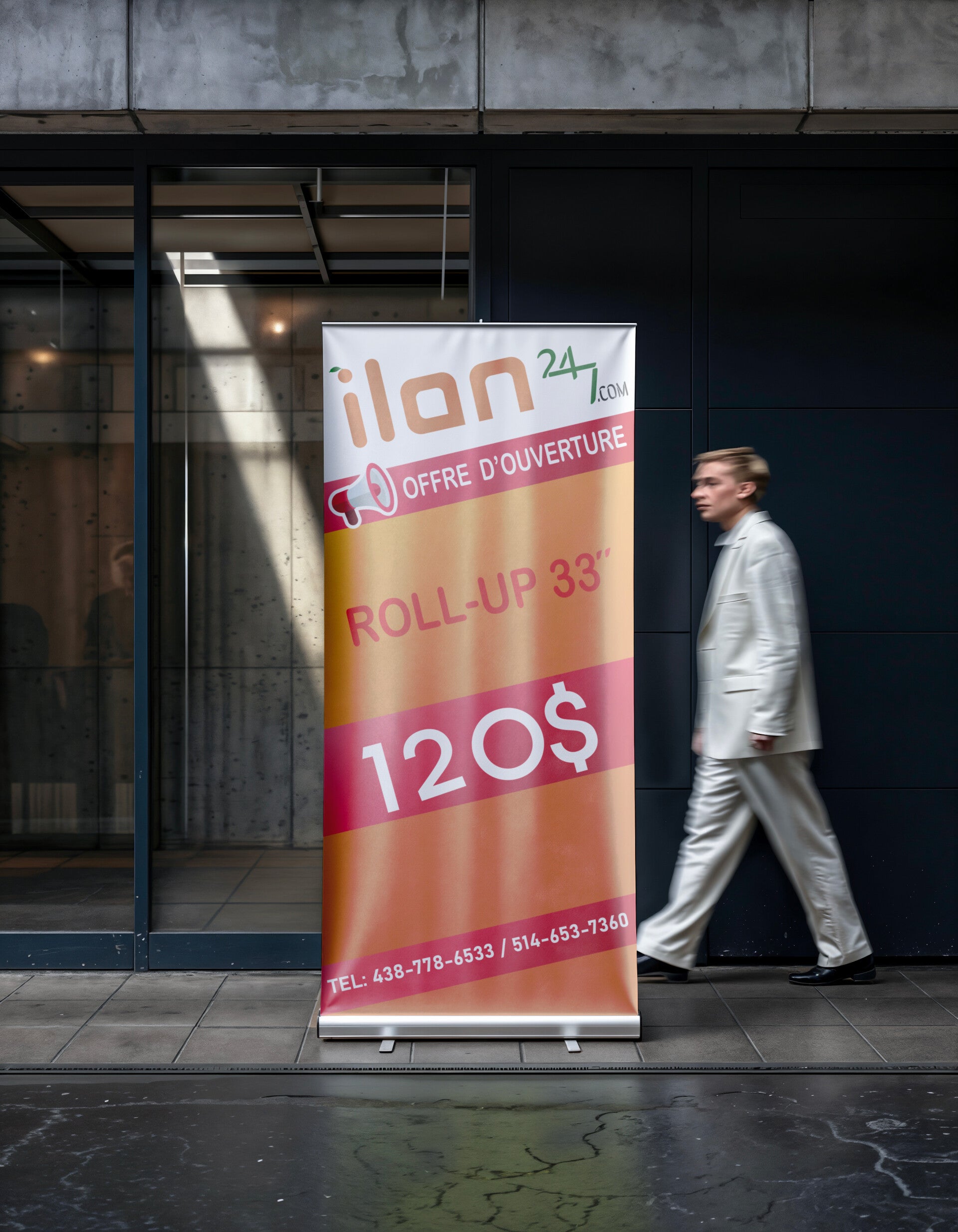 Découvrez nos services de supports publicitaires innovants chez ilan247. Impression grand format, Roll-Up, X-Banner et plus encore.